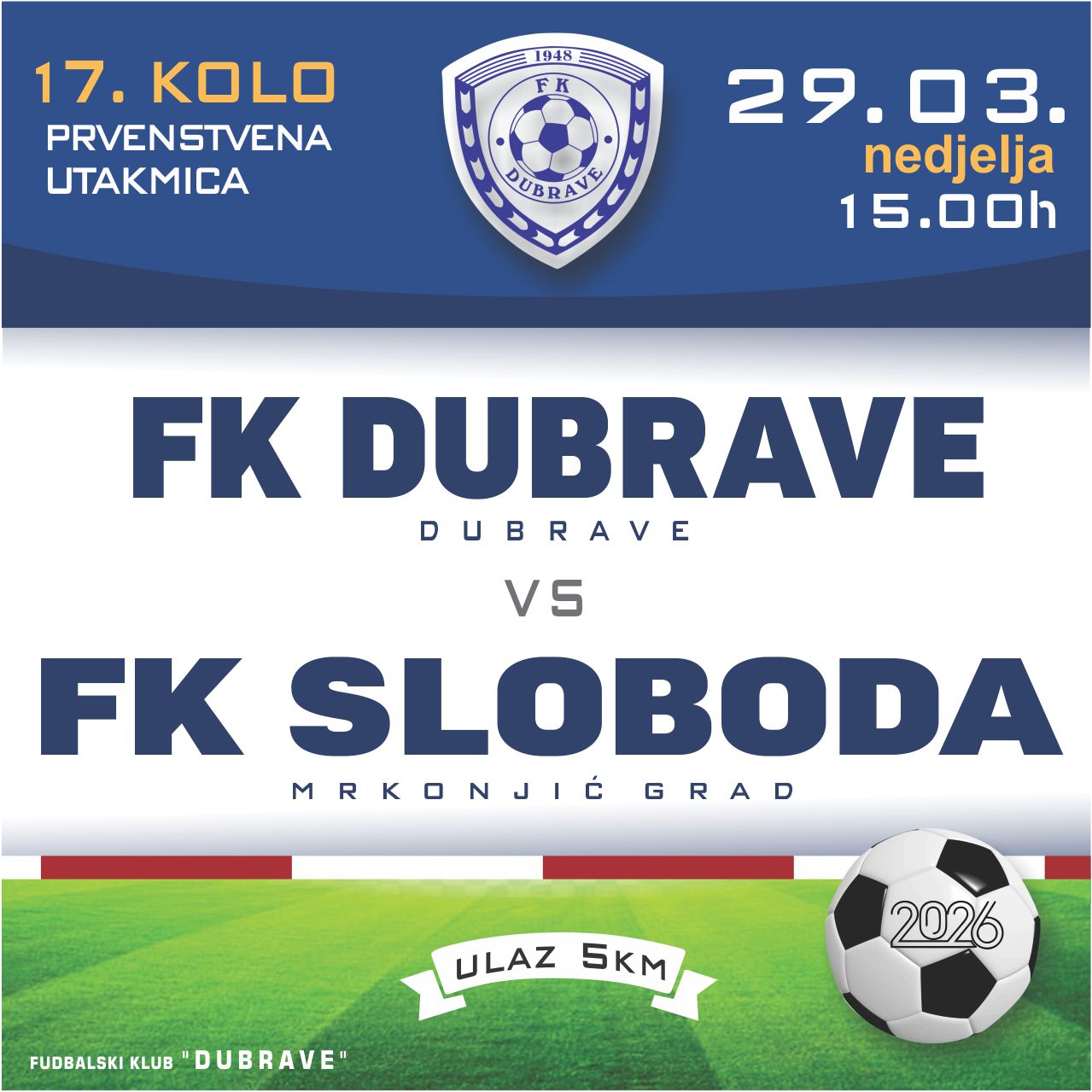 Na stadionu FK Dubrave, u nedjelju 29. marta, sa početkom u 15.00 časova, snage će odmjeriti FK Dubrave i FK Sloboda. Ova prvenstvena utakmica predstavlja priliku za domaći tim da pred svojim navijačima dođe do važnih bodova, dok gosti dolaze sa jasnim ciljem da ostvare pozitivan rezultat na gostovanju.