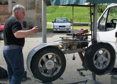 – Akumulator pokreće dizalicu, a isti efekat obezbeđujem i ručno, čekrkom. Pilana je lagana, veoma precizna, lako se i jednostavno rukuje, a sve poslove može odraditi jedan čovek. Sajla za gas je na ručki od skutera, samo je razlika što dodavanjem gasa u ovom slučaju ubrzavam pilu koja nestaje u balvanu, a u suprotnom, kada sve demontiram, ista ručica pokreće točak koji juri drumom – zaokružuje Miroslav svoje teoretisanje, čas o pilani a čas o motociklu.