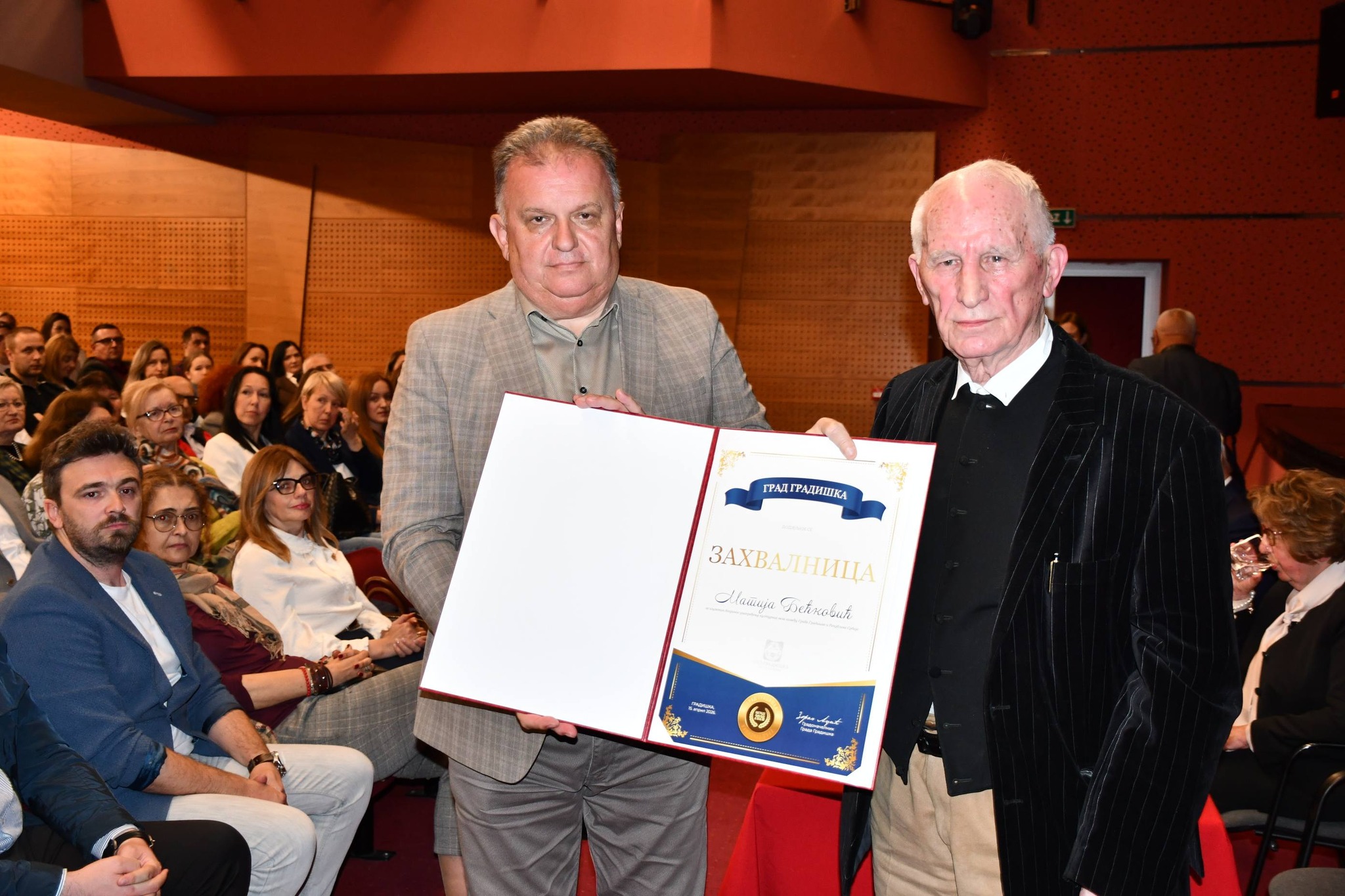 Gradonačelnik Zoran Adžić uručio je akademiku Matiji Bećkoviću Zahvalnicu za izuzetan doprinos unapređenju kulturnih veza Gradiške, Republike Srpske i Srbije.