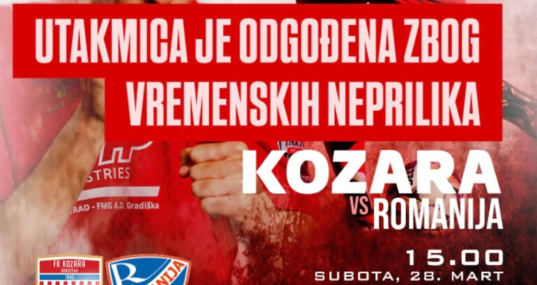 Utakmica 22. kola fudbalskog šampionata Republike Srpske između Kozare i Romanije koja je trebala biti odigrana sutra, odložena je zbog vremenskih neprilika.