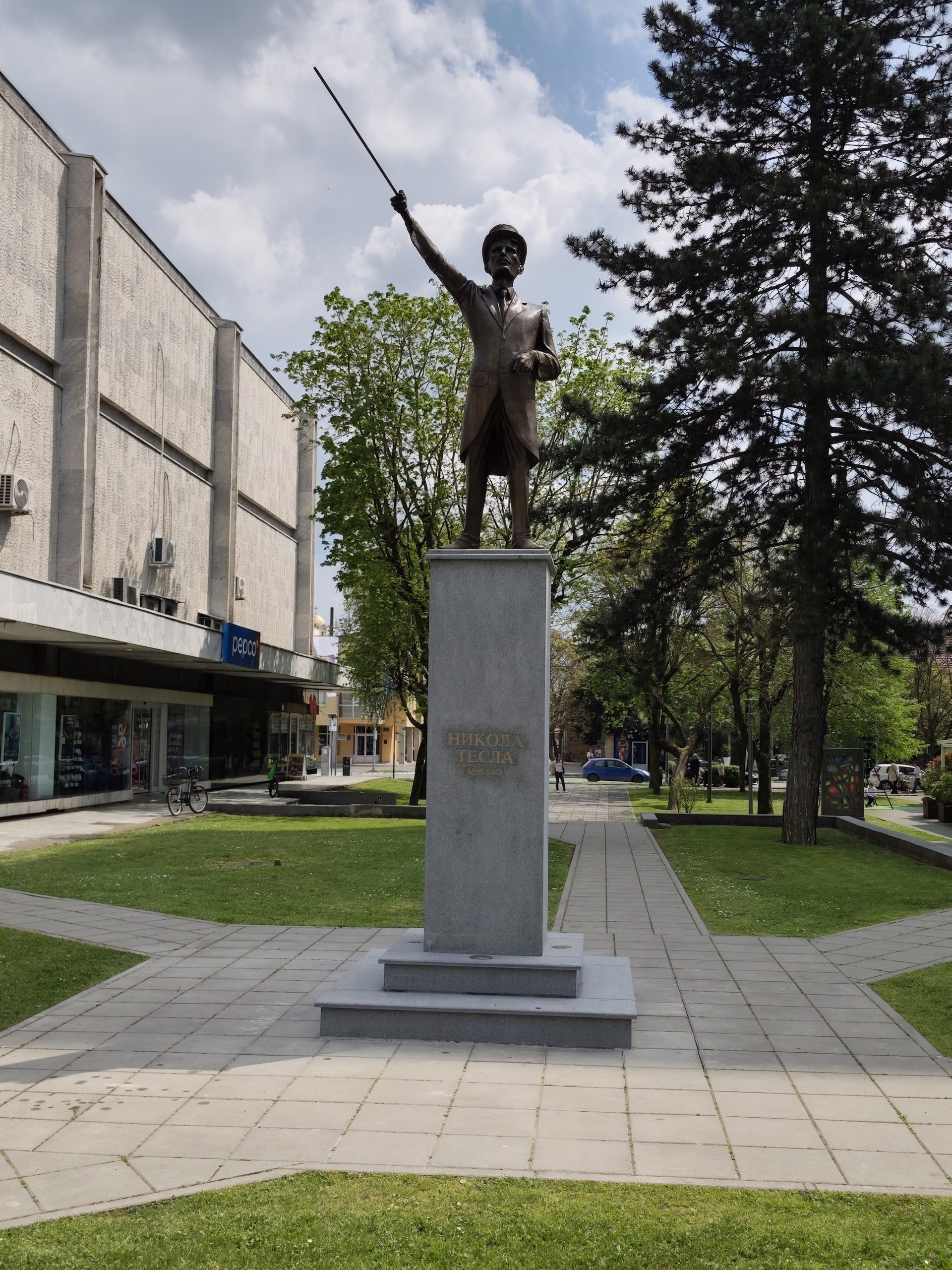 Statua Nikole Tesle, obučenog u gospodski frak, sa cilindrom na glavi i podignutim štapom u ruci, postavljena na trgu kod Kulturnog centra Gradiška, djelo je skulptora Bojana Mikulića.