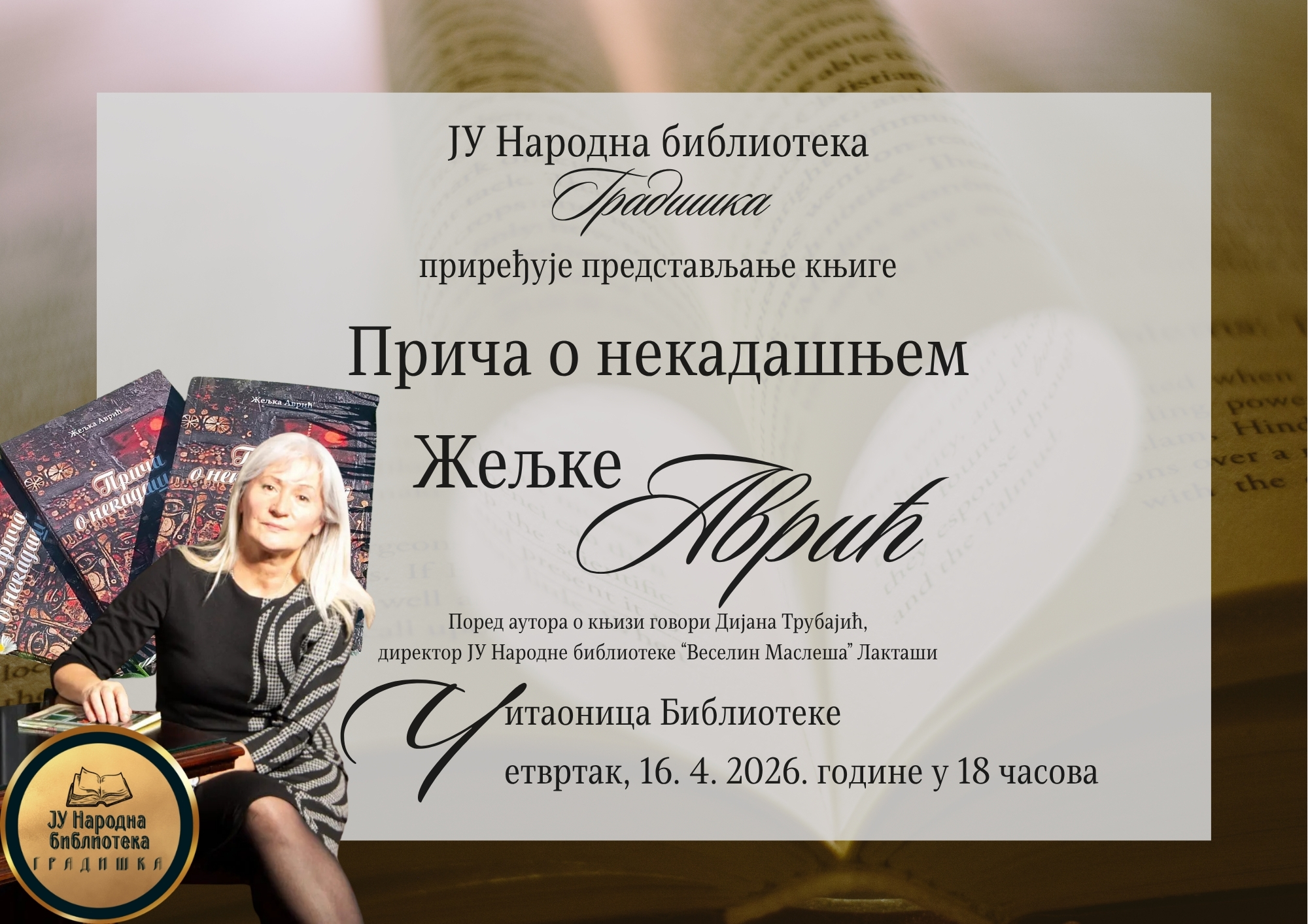 Knjiga „Priča o nekadašnjem“, autorke Željke Avrić, biće predstavljena u čitaonici Narodne biblioteke u Gradišci u četvrtak, 16. aprila u 18 časova.