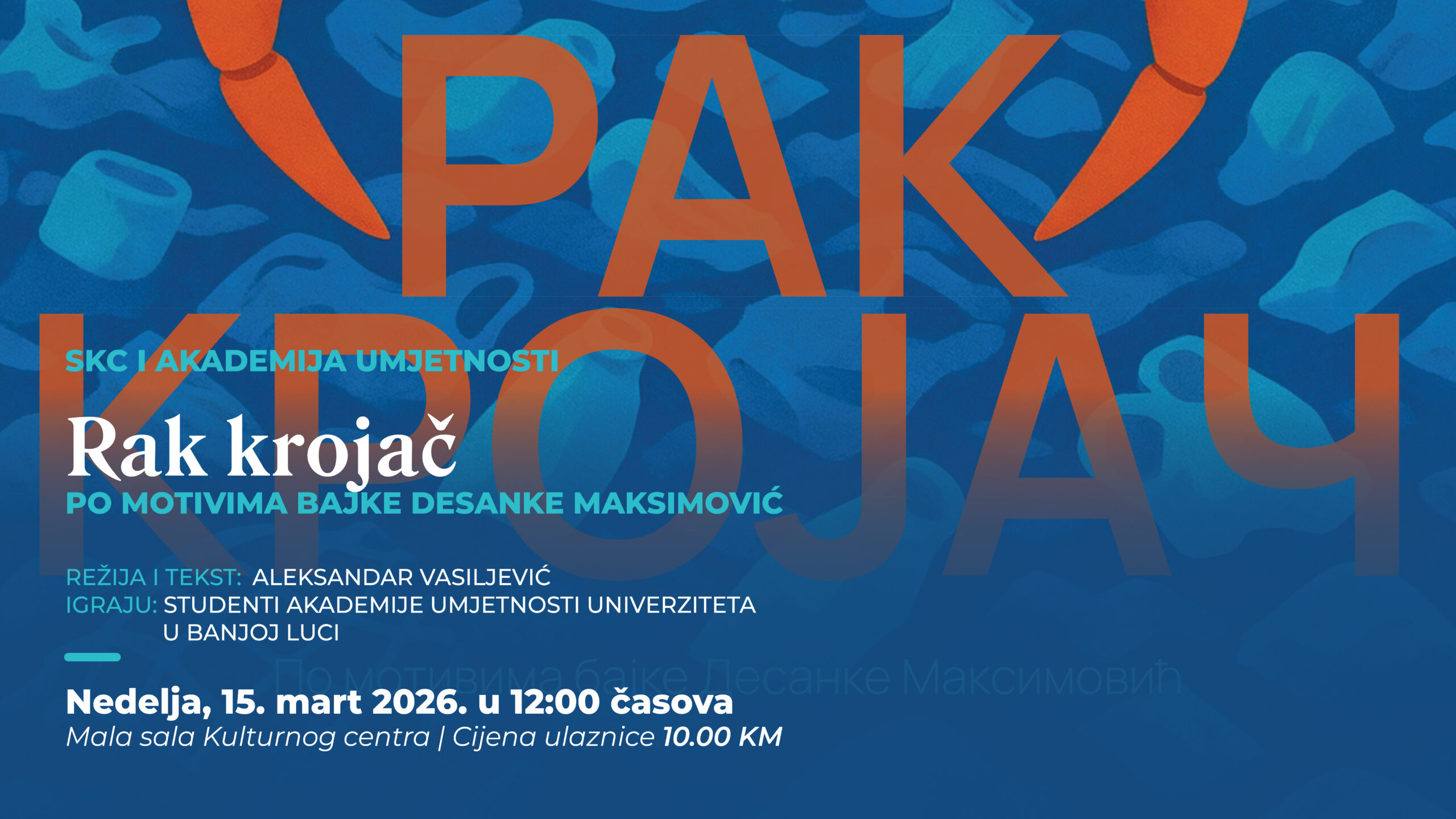 Dječija lutkarska predstava „Rak krojač“, po motivima bajke Desanke Maksimović, biće odigrana u Kulturnom centru u nedjelju, 15. marta u 12 časova.