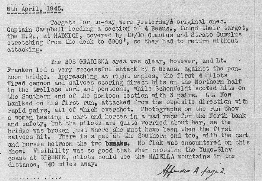 U izvještaju o ovom napadu se navodi da su od prvobitnog pontonskog mosta ostala samo njegova drvena struktura na oba kraja obale, što je rezultat napada eskadrile pod potpukovnikom Tilijem 5. aprila.